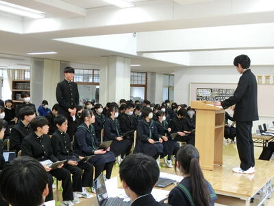 4月25日(金)、今年度(前期)の岩中生徒会における活動の方向性や計画などを確認する生徒総会が開かれました。生徒会スローガン「創造~常に前進し、革新する岩中~」や活動内容が承認されました。