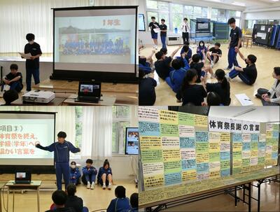 5月16日(金)、生徒会執行部による体育祭を振り返る総括集会が行われました。「体育祭活動に本気で取り組むことができたか」の集計結果や感想が学級ごとに伝えられました。どの学級も高い達成率となり、スローガン「Do my best!Do our best!」に込めた願いにあるように、多くの生徒が自分自身や各集団の成長を実感していました。